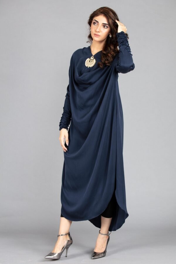 Description: A long flared dress with pleated long sleeves, detailed with pearls and zardozi motif on neckline.