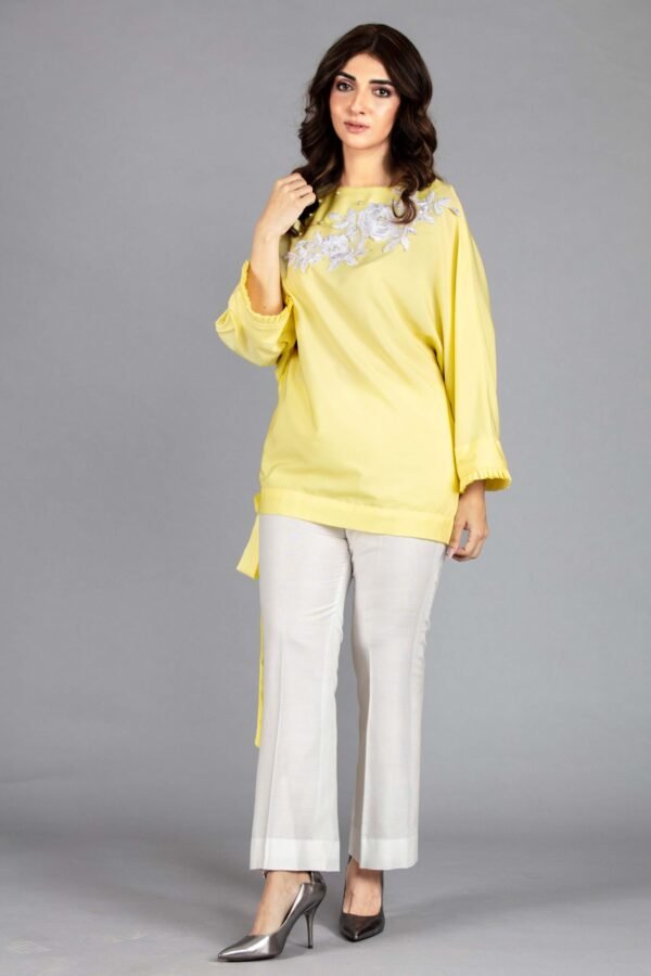 Description: A yellow batwing top with pleated edges. White embroidered neckline detailed with pearls.